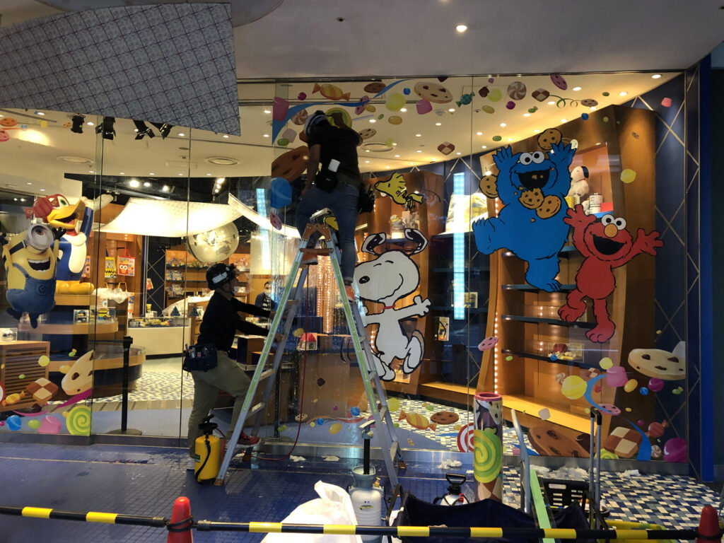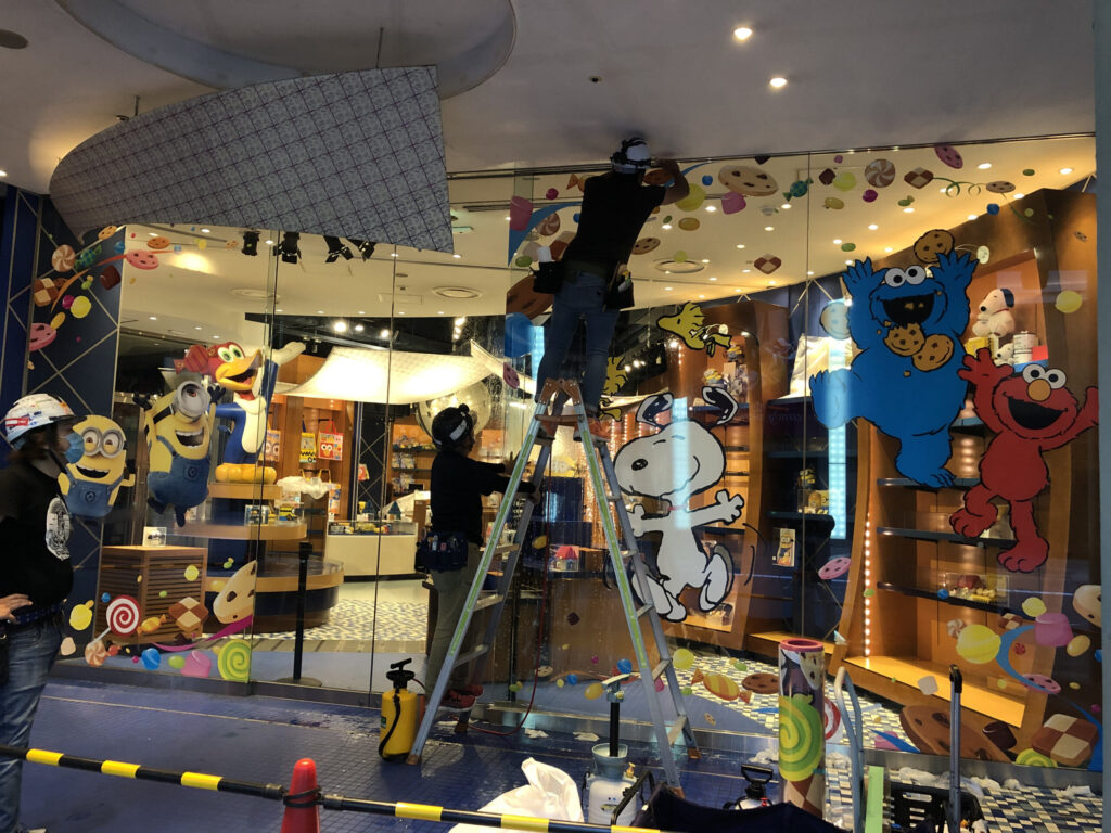 USJ様の施設内のガラス麺にインクジェットシートを貼らせて頂きました。