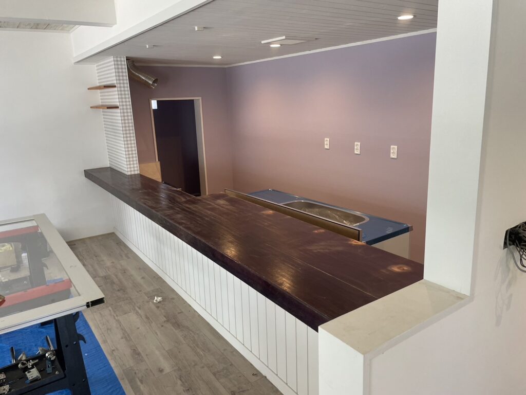 経年劣化した木のカウンターへダイノックシートでラッピング。